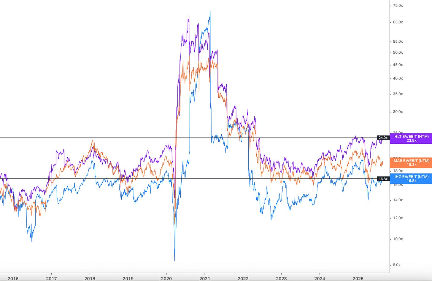IHG vs HLT/MAR EV/EBIT, 2015-2025